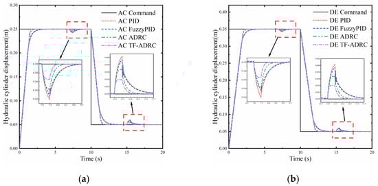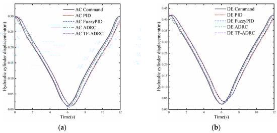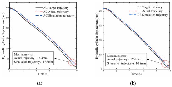 Tracking of the two hydraulic cylinders for the planned trajectory. (a) Tracking of planned trajectories by AC hydraulic cylinder; (b) tracking of planned trajectories by DE hydraulic cylinder.