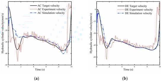 Velocity tracking of the experimental equipment and simulation model for the planned trajectory. (a) AC hydraulic cylinder velocity tracking; (b) DE hydraulic cylinder velocity tracking.