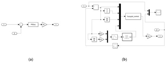 To compare and verify the performance of several controllers, controller simulation models for a PID controller, fuzzy PID controller, ADRC, and TF-ADRC were built. The fuzzy modules in the fuzzy PID controller and TF-ADRC were built using the fuzzy toolbox in MATLAB and Figure 16 shows the simulation model of the controllers.