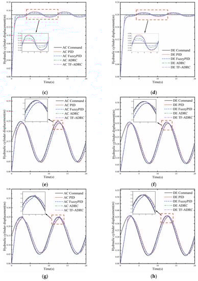 As shown in Figure 17a,b, the response of two hydraulic cylinders with different control methods to the step square wave signal was verified by applying a load of 30,000 N for 0.5 s in opposite directions at 7 s and 15 s. Whether the hydraulic cylinder extends or retracts, the system generates a certain disturbance, as shown by Equation (18); the system model, system pressure, flow rate, and displacement of the hydraulic cylinder change with changes in the external load FL. As can be observed, the response times of the ADRC and TF-ADRC were faster, both reaching a steady state within 2 s, while the PID and fuzzy PID controllers required a longer time to reach the target point, reaching a steady state at approximately 3 s. At the 7 and 15 s positions, the ADRC and TF-ADRC exhibited less error under load disturbance because the self-anti-disturbance controller generates a faster and higher amplitude control signal when the step load disturbs the system output, making the system respond faster and reducing the effect of the disturbance on the system. Figure 17c,d shows the step response under a sinusoidal load . The steady-state error of the system using self-rejecting control was less than that of the system using a PID controller, indicating that the system with the ADRC is more robust and can adapt well to the effects of system model changes and load perturbations because the ESO module of the ADRC predicts the output and total real-time perturbations of the system and the LSEF module generates corresponding control quantities based on the perturbations. Figure 17e,f shows the tracking of the two hydraulic cylinders for a sinusoidal signal at a constant load of 10,000 N. The results show that the system with the ADRC and TF-ADRC exhibited a better input tracking performance, and the system with PID and fuzzy PID controllers exhibited more hysteresis. The tracking effects of the PID and fuzzy PID controllers are no longer satisfactory for complex signals when the hydraulic cylinder has a large load. To further investigate the comprehensive performance of the ADRC and TF-ADRC, random loads of −30,000–30,000 N were set in the AC and DE cylinders, as shown in Figure 17g,h, and sinusoidal signals were tracked. Both the PID and fuzzy PID controllers have unsatisfactory tracking effects under variable load conditions, which indicate that the PID control strategy finds it difficult to adapt to to complex conditions, whereas the ADRC-based control strategy can generate stronger control signals to compensate for the error caused by high-load conditions and has better overall anti-interference capability.