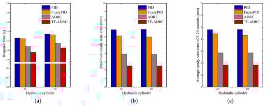 Table 4 shows the response data of the two hydraulic cylinders to the square wave signal. Analysis shows that the performance of the TF-ADRC was improved compared with the traditional PID controller and ADRC, and the control accuracy was higher than the latter. Taking the AC hydraulic cylinder as an example, the response time of extension and retraction of the TF-ADRC was 1.40 s and 1.55 s, the maximum steady-state error was 3.48 mm and −4.05 mm, and the average steady-state error was 0.31 mm and −0.42 mm, respectively. When using the ADRC controller, the response time was 1.46 s and 1.67 s, the maximum steady-state error was 5.78 mm and −6.78 mm, and the average steady-state error was 0.59 mm and −0.71 mm. When using the PID controller, the response time was 1.73 s and 2.51 s, the maximum steady-state error was 8.15 mm and −10.30 mm, and the average steady-state error was 0.92 mm and −1.33 mm. When using the fuzzy PID controller, the response time was 1.68 s and 2.54 s, the maximum steady-state error was 7.32 mm and −9.47 mm, and the average steady-state error was 0.85 mm and −1.21 mm, respectively. Compared with the ADRC, the response time was reduced by 4.11% and 7.19%, the maximum steady-state error was reduced by 39.8% and 40.3%, and the average steady-state error was reduced by 47.5% and 40.8%, respectively. Compared with the PID controller, the response times of the extension and retraction were reduced by 19.1% and 38.2%, respectively; the maximum steady-state errors were reduced by 57.3% and 60.7%, respectively; the average steady-state errors were reduced by 66.3% and 68.4%, respectively. Compared with the fuzzy PID controller, the response times of the extension and the retraction controller were reduced by 16.7% and 39.0%, respectively; the maximum steady-state errors were reduced by 52.0% and 57.2%, respectively; the average steady-state error were reduced by 63.5% and 65.3%, respectively.