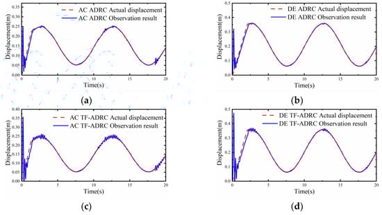 ESO observation results under the random load. (a) ESO observation of the ADRC controller for AC hydraulic cylinders; (b) ESO observation of the ADRC controller for DE hydraulic cylinders; (c) ESO observation of the TF-ADRC controller for AC hydraulic cylinders; (d) ESO observation of the TF-ADRC controller for DE hydraulic cylinders.