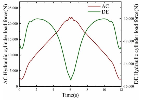 Figure 14a,b shows the tracking of the AC and DE hydraulic cylinders for the planned hydraulic cylinder displacement curve, respectively. As can be observed in the experiment, the tracking of the physical MAIR with the AMESim simulation model for the planned trajectory was approximately the same when the PID control scheme was used. The maximum deviation allowed for the displacement tracking trajectory of IRMA hydraulic cylinders is ±20 mm. The trajectory tracking errors of the experimental and simulation models of the AC and DE hydraulic cylinders in Figure 14 were both within 20 mm, which meet the engineering requirements.