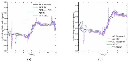 Velocity tracking of two hydraulic cylinders. (a) Velocity tracking of AC hydraulic cylinders for planned trajectory; (b) velocity tracking of DE hydraulic cylinders for planned trajectory.