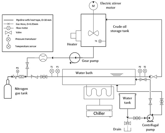 Nitrogen gas is an inert gas and makes up 78.1% by volume of the atmosphere. In oil and gas application, nitrogen gas was used in pressure purging and testing applications [9,28,29], as well as in supporting various operations, such as drilling, cementing, and well completion. Additionally, nitrogen gas was utilized as a wax dispersant additive in paraffinic gas oils. In a study performed by El-Gamal et al. [30], the existence of polar nitrogen/oxygen-containing functional groups is the origin of induced dipole attractive forces in the n-paraffin molecules of crude oil during crystallization. Consequently, a secondary attractive force is formed that has a dispersing effect of wax dispersant. In another study by Struchkov et al. [31], nitrogen gas was also found to reduce the WAT in oil. Nevertheless, investigation on the effect of nitrogen gas in flowing waxy crude oil at various rates remains limited. Hence, this study aims to investigate the effects of crude oil and nitrogen gas flow rates on the time taken for flow initiation using a flow loop system.