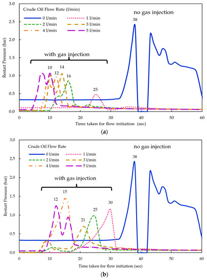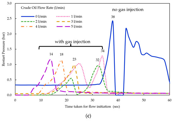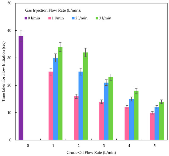A similar trend was observed in Figure 3b,c, where the time taken for flow initiation was reduced as the crude oil flow rate increased. Analysis is conducted for both figures at the same time. Here, we found that at 1 L/min crude oil, the time taken is reduced by 21.1% and 10.5% at 2 L/min and 3 L/min gas flow rate, respectively. Meanwhile at 5 L/min crude oil, the time taken is further reduced, which is by 68.4% and 63.2% at 2 L/min and 3 L/min gas flow rate, respectively. The finding is in agreement with work from Junyi and Hasan [38], who revealed that wax deposition decreased as the flow rate in the waxy crude oil pipeline was enhanced. When wax deposition was decreased, the flow initiation was at ease, since there were less restrictions of solid blockage to be overcome during the pipeline restart. Consequently, this led to a shorter time taken for flow initiation. The research findings from Kelechukwu et al. [39] also support the results of this study, where wax deposition was reduced as the flow rate was increased to turbulence flow. In addition, Cabanillas et al. [40] highlighted that the thickness of the deposited wax declined as the flow rate intensified. Additionally, the discovery is consistent with findings of past studies by Mahto and Kumar [41], who summarized that the wax precipitation increased as the flow rate decreased in the laminar flow, due to the expansion of accessibility of the solid wax particles to deposit on the inner surface of the pipeline.