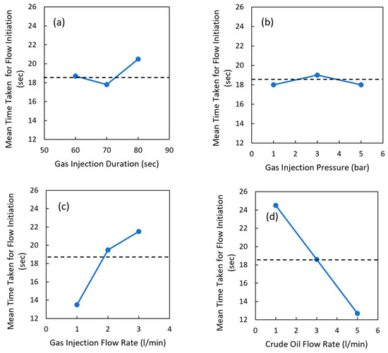 Main effects plot for time taken for flow initiation for different factors: (a) gas injection duration, (b) gas injection pressure, (c) gas injection flow rate, and (d) crude oil flow rate.