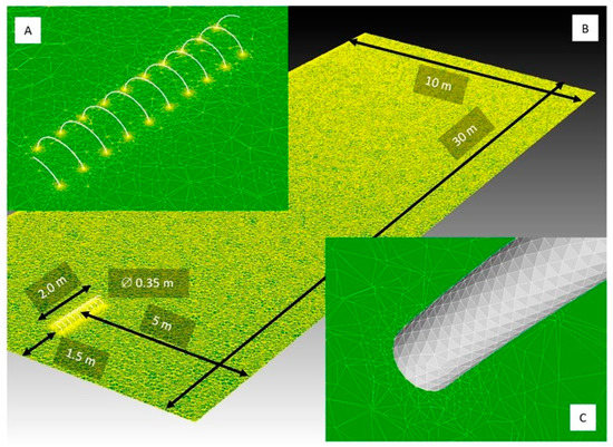 In Figure 2, the dimensions of the computational domain and earth basket spiral heat exchanger are given, together with images of the computational mesh in 3 grades of detail (B: overview, A: detail of the full slinky and C: detail of one ring of the slinky).