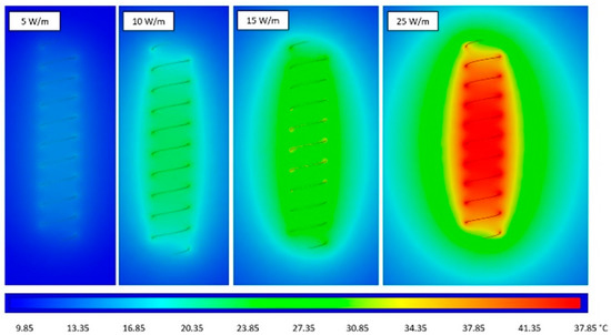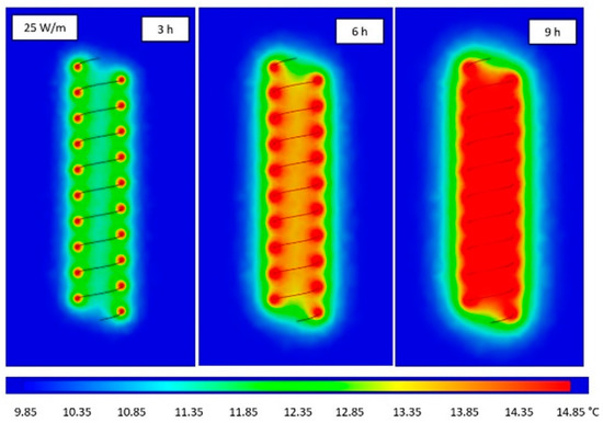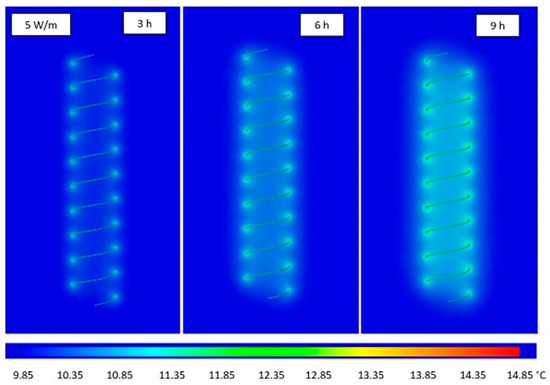 For the visualization of the resulting temperature field on a vertical plane through the earth basket spiral heat exchanger and the surface temperature on the helix rings, Figure 3 and Figure 4 show the evolution for three different times (3 h, 6 h and 9 h). In Figure 3, the specific heat injection rate was set to 5 W/m and the results presented in Figure 4 correspond to a specific heat injection rate of 25 W/m. The colour gradient was set to the same values in Figure 3 and Figure 4. Here, only the results of CFD calculations are shown. For the transient case, the calculation times for FLS would be prohibitive because each point in the plane would have to be calculated separately.
