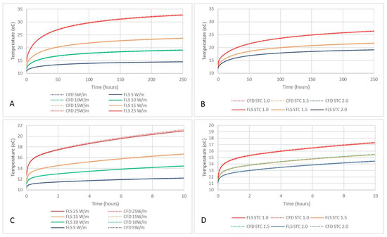 Figure 6 compares the CFD and FLS results for the six sets of boundary conditions both for long-term behaviour (A and B) and short-term behaviour (C and D). The left figures show a comparison of different specific heat injection rates and the right figures show a comparison for different thermal conductivities of the soil. Table A1, Table A2, Table A3 and Table A4 in Appendix A list the surface temperature values for both the FLS and CFD results for the first 10 h and every 50 h up to 250 h, including the result for the steady state.
