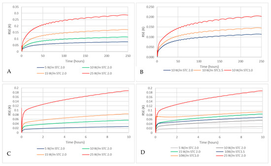 Root-square-error between CFD and FLS solutions for 250 h 900 s timestep simulations (top graphs) and 10 h 90 s time step detailed simulations (bottom graphs). (A): 250 h 900 s timestep with different specific heat injection rates (soil thermal conductivity 2.0 W/mK); (B): 250 h 900 s timestep with 10 W/m specific heat injection rate and different soil thermal conductivities. (C): 10 h 90 s timestep with different specific heat injection rates (soil thermal conductivity 2.0 W/mK); (D): 10 h 90 s timestep with 10 W/m heat injection rate and different soil thermal conductivities.