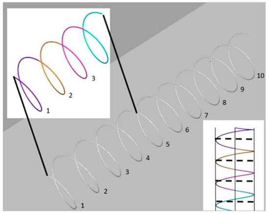 Figure A1 shows a drawing of an earth basket spiral heat exchanger (with two separate earth basket spiral heat exchangers) with its mirror source. The average tube wall temperature was calculated by the superposition of all ring sources with the temperature effect of each single ring source calculated by: