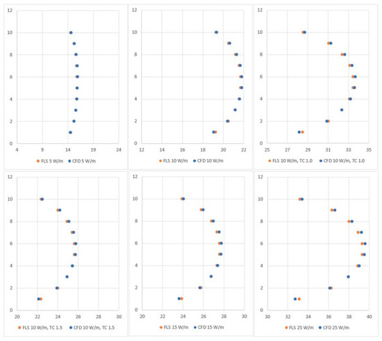 For the different sets of boundary conditions presented above, temperatures were evaluated on the 10 different sections of the CFD earth basket heat exchanger and compared with the results of the FLS. This comparison was performed for the steady-state solution as it was not practical to compute the individual ring solutions for transient simulation (see Figure 9). Overall, there was good correspondence with the solutions for the individual rings between the FLS and CFD. The difference between FLS and CFD was about 0.4 K, showing an average error over all rings of 0.06 K–0.23 K.