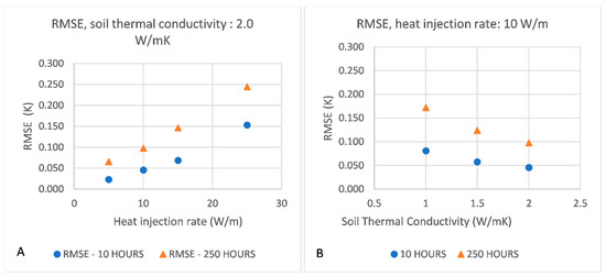 (A): Root-mean-square error (RMSE) at different specific heat injection rates for a 10 h 90 s timestep and a 250 h 900 s timestep. Soil thermal conductivity: 2.0 W/mK. (B): Root-mean-square error at different soil thermal conductivities for a 10 h 90 s timestep and a 250 h 900 s timestep; specific heat injection rate: 10 W/m.