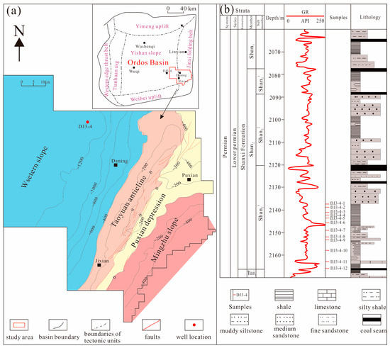 Figure 1. (a) Location of study areas of the sedimentary facies [38]; (b) stratigraphy of the Shanxi Formation.