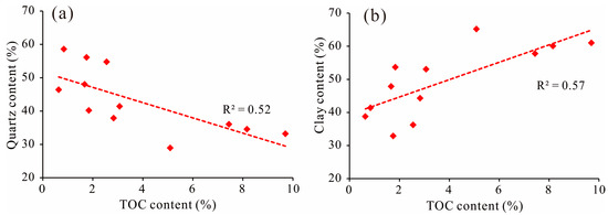 Figure 2. (a) Connection between the TOC and quartz content; (b) connection between the clay mineral content and TOC.