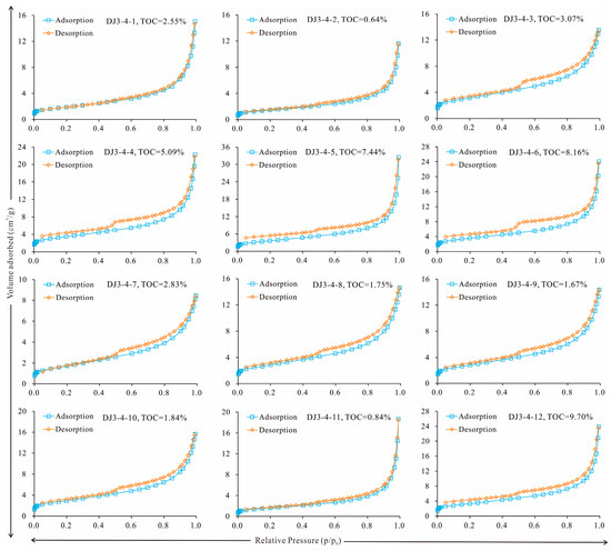 The LT-N2A isothermal curves of 12 transitional shale samples (Figure 5) show that the shapes of the shale adsorption curves are similar to a certain degree, but different samples also show differences [51,52,53,54,55]. Based on the adsorption isotherm division scheme proposed by IUPAC [50], the adsorption isotherms of 12 shale samples from the Shanxi Formation in this study are all type IV, but the morphological differences are large, mainly because of the strong heterogeneity of shale [15,46,51]. The adsorption process may be loosely separated into three phases based on the fluctuation tendency of the N2 isothermal adsorption curve: (1) when p/p0 = 0~0.3, the adsorption curve rises slowly and presents a slightly convex shape. When p/p0 = 0.3, the monomolecular layer on the pore surface is basically saturated, and adsorption gradually transitions to multimolecular layer adsorption with increasing relative pressure. (2) When p/p0 = 0.3~0.9, the gas adsorption capacity increases steadily with increasing relative pressure. (3) When p/p0 = 0.9~1.0, the adsorption curve rapidly becomes steeper and does not reach saturation when p/p0 is close to 1. This mostly results from the condensation of gas, demonstrating that the shale has a particular number of macropores or microfractures [56,57,58]. The adsorption and desorption curves are divided from 0.45 to 0.9, and a hysteresis loop forms between the two curves. This is because capillary condensation occurs in this relative pressure interval [2,15,29,35,50], and the adsorption and desorption processes cannot be completely reversible. At the same time, the formation of the hysteresis ring is similar to that of the H3 type, indicating the development of slit-type and parallel plate-like pores in the Shanxi Formation shale [59,60].