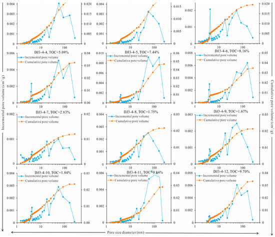The pore structure characteristics of the shale samples were determined by quantitatively analysing the LT-N2A experimental data and were based on the theoretical BET and BJH models, as shown in Table 3. The BET-SSA values of shale pores range from 5.118 m2/g to 12.812 m2/g, with a mean value of 9.542 m2/g. BJH-PV parameters range from 0.012 cm3/g to 0.047 cm3/g, with 0.026 cm3/g being the average. Marine–continental transitional shales have SSA and PV values that are somewhat higher than those of continental shales and quite similar to those of lacustrine shales [16,21,22,23,24,49,50,51]. The pore diameter distribution curve is calculated based on the LT-N2A experiment, as shown in Figure 6. The relationship between the pore size and pore volume is shown by a curve with multiple peaks. The peaks are at 3~5 nm, 10~22 nm, and 22~270 nm, and the maximum cumulative pore volume reaches 0.047 cm3/g.