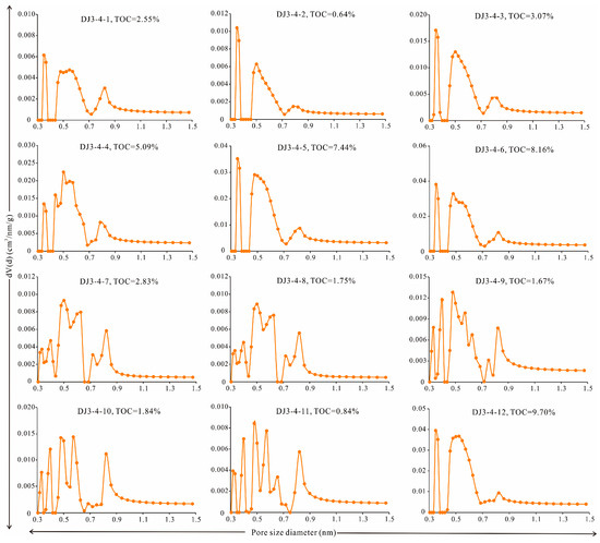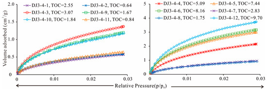 The LP-CO2A isothermal adsorption curve is shown in Figure 7. The curve type corresponds to an isotherm of type I, which reflects the micropore filling phenomenon in shale samples, indicating the development of a certain number of micropores in shale [11,22,23,24]. The morphologies of the CO2 adsorption curves of different samples are similar, but the maximum adsorption amount of CO2 is different, which shows the micropore-scale pore structure of different shale samples [20,24,25]. In the Shanxi Formation, the samples with greater organic carbon content often have higher CO2 adsorption gas volume, which indicates the larger pore volume of shale micropores. This finding suggests that the TOC content is directly correlated with the level of micropore development.