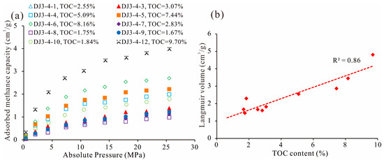 Figure 9. (a) Isothermal adsorption curves of shale samples and (b) associations between the TOC and Langmuir volume of shale samples.