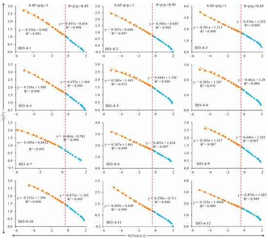 In Formula (1),  V  is the quantity of gas molecules that have been adsorbed at equilibrium pressure p, in cm3/g;  V m  is the monolayer covering volume, in cm3/g;  C  is a constant;  p 0  is the saturated vapour pressure of gas adsorption, in MPa; and A is the coefficient related to the fractal dimension (D).  A  can be determined by using the slope of the fitted line in the graph  l n V  and  l n [ l n ( p 0 / p ) ] , and  D  can be calculated by the value of  A . The calculation formula is as follows: