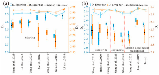 Figure 11. Comparison of the fractal dimensions of marine, continental, lacustrine, and transitional shales in typical basins [5,6,7,13,15,16,20,36,40,44,45,46,54,55,56,57]. (a): Marine shale; (b): Lacustrine, continental, marine–continental transitional shale.