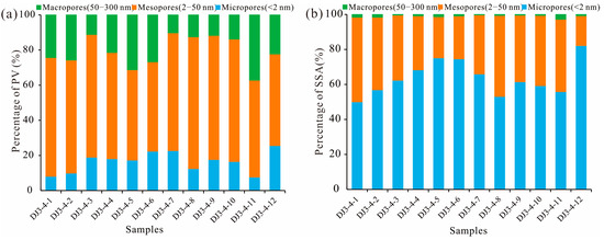 (3) The transitional shale samples have total SSA values ranging from 11.126 to 47.220 m2/g, with a mean of 25.754 m2/g. The total PV values range from 0.014 to 0.056 cm3/g, with a mean of 0.031 cm3/g. Micropores were found to contribute the most to the total SSA, while mesoporous pores were found to contribute the most to the total PV.