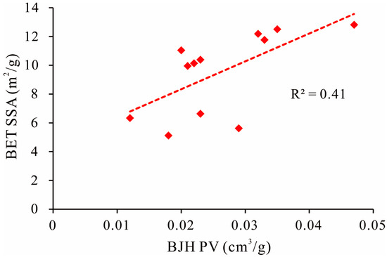 The SSA values of shale vary from 6.29 m2/g to 38.80 m2/g (mean of 17.49 m2/g), whereas those of micropores are in the range of 6.29 m2/g to 38.80 m2/g. The mean mesoporous SSA is 8.03 m2/g, with a range of 4.62 m2/g to 10.94 m2/g. The macropore SSA values ranges from 0.09 m2/g to 0.58 m2/g (mean of 0.24 m2/g) (Table 6). Figure 12b demonstrates how extremely diverse the SSA of the Shanxi Formation shale is, with significant variations across various samples. Nonetheless, the majority of SSA values are generally provided by micropores and mesopores, whose comparative surface areas vary across samples, whereas macropores provide the least SSA [31,32,33,34,35]. The association between BJH-PV and BET-SSA is shown in Figure 13. Overall, there is a considerable positive association (R2 = 0.41) with a few anomalies, which is consistent with earlier research on lacustrine shale, transitional shale, and marine shale [9,15,16,35,36,37,38,39].
