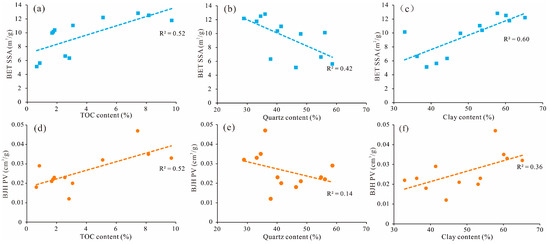 Figure 14. Links between the pore structure parameters, quartz, TOC values, and clay minerals. (a,d): TOC versus BET-SSA and BJH-PV; (b,e) quartz content versus BET-SSA and BJH-PV; and (c,f) clay content versus BET-SSA and BJH-PV.