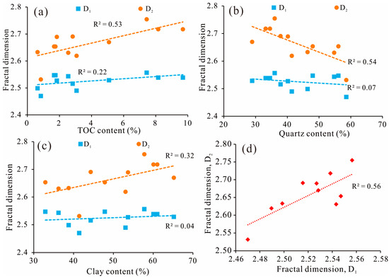 The complexity of the pores may be quantitatively described by the size of the fractal dimension, which is directly correlated with the growth of the pores. Therefore, the factors that control shale pores all affect the fractal dimension [21,34,35]. The main influential factors include the shale mineral composition, TOC content, burial depth, and diagenetic evolution stage [13,14,15]. As shown in Figure 15a, D1 and D2 are positively correlated with the TOC content (R2 = 0.22 and R2 = 0.53, respectively), demonstrating that as the amount of organic matter increases, the complexity of the pore structure of the shale and its capacity for adsorption also increase. This is in line with the results from lacustrine shales, continental shales, and marine gas shales because a greater TOC content causes the organic matter to produce more micropores, which leads to a more complex pore structure and an increased D value [15,21,22].