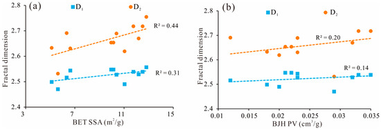 Figure 16. Pore structural parameters and fractal dimensions in relation to each other. (a) BJH-PV versus D1 and D2; (b) BET-SSA versus D1 and D2.