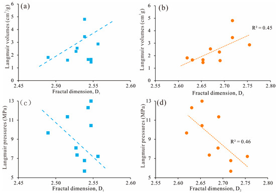 Figure 17. (a,b) Relationships between the Langmuir volume and D1 and D2; (c,d) affiliations between Langmuir pressures and D1 and D2.