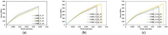 The basic material properties under tension, compression and shear were obtained using material samples cut from the base plate. Four samples for each test were cut out from the base plate, and the tests were conducted using a 100 KN MTS universal testing machine. According to ASTM D3039 [36], the tensile tests are carried out using a feed rate of 2 mm/min. The tensile strengths in longitudinal direction (), transverse direction (), elastic modulus ( and ) and poisons ratio () were obtained from the tensile stress–strain curve. The compression test was carried out according to ASTM D6641 [37] to determine the compressive strengths () using a feed rate of 2 mm/min. A v-notched rail shear test was carried out at 2 mm/min, according to ASTM D7078 [38], to determine the in-plane shear strength () and modulus () of the composite. The results obtained from the sample testing with the basic standard deviation are presented in Table 1. The stress–strain curves obtained from the tests from tensile, compression and shear are presented in Figure 2, Figure 3 and Figure 4, respectively. Similar ASTM standards were referred to by several authors to determine the mechanical properties of CFRP laminates [39,40,41].