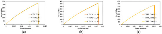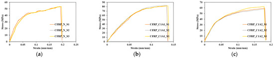 Stress–strain curves for (a) Tensile Test results for Neat samples (b) Tensile Test results for C1A1 samples (c) Tensile Test results for C1A2 samples.