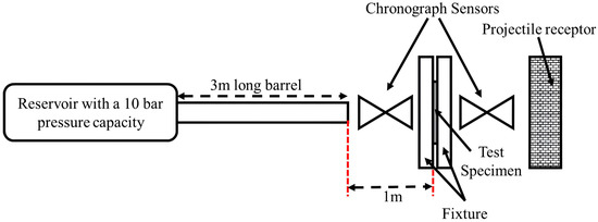 A single-stage gas gun system was used for the projectile impact test, as illustrated in Figure 5. A compressor, reservoir with a 10 bar pressure capacity, regulating valve, barrel, and a rebound protection casing to prevent the reflecting bullet are all part of the test setup. During projectile impact testing, the air is pressurized to a certain pressure in the reservoir using a compressor, and the pressurized air is discharged into the barrel to launch the projectile at the required muzzle velocity. As shown in Figure 6, projectiles of two shapes, spherical (12 mm diameter and 7.12 g mass) and conical (12 mm diameter with an apex angle of 60°, 14.5 mm length, and 7.62 g mass), were used to investigate the projectile impact response of CFRP composite laminates. The composite plate experiments were carried out by clamping the test plate between two fixture plates made of mild steel plates of 20 mm thickness with the same dimensions as the test plates (140 mm × 140 mm) with an exposed area of 80 mm × 80 mm. The test plate is secured to the fixture using 12 M8 bolts to simulate clamped conditions. Figure 7 depicts the entire test setup.