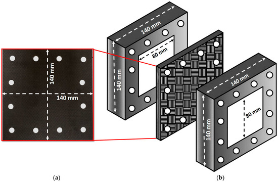 Multiple manufacturing processes exist for the effective fabrication of composite laminates, but the pultrusion manufacturing method is the most cost-effective of all known processes [34,35]. In the presented study, CFRP composite specimens were manufactured using a hand layup approach followed by a vacuum bagging procedure, as shown in Figure 1. Six 500 mm × 500 mm square pieces with [0/90] layup configuration were placed and cured with epoxy resin to make a composite laminate of 1.5 mm thickness. Nanofillers were impregnated into the epoxy matrix using an ultrasonic processor at 30 kHz for approximately 60 min to improve matrix-fiber bonding properties. Before fabrication, the composite consisting of pure epoxy, C1A1 and C1A2 nanofiller configuration was mechanically mixed at room temperature to avoid additional agglomerations. Following the addition of nanofillers, the composite laminate was vacuum bagged and cured at room temperature for 24 h. The fiber volume percentage of the specimen was determined using the burn-out method (ASTM D3171) and was found to be in the 53–55%. To cut composite plates into 140 mm × 140 mm, water jet cutting with a 1mm cutting edge margin was used. Further, 12 holes of 8 mm diameter were drilled into the specimen with a feed rate of 0.20 mm/rev and a spindle speed of 1320 rpm to secure the specimen in the impact fixture.