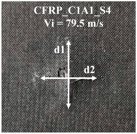 To investigate the effect of projectile geometry on the impact response of neat CFRP, C1A1 and C1A2 samples, four impact energies were maintained for each projectile geometry, totaling 24 experiments, with eight experiments for each laminate variant. After each impact test, the test panels were analyzed using ImageJ 1.53e (free software) to assess the back-face damage. The visible damage on all of the panels was divided into three categories, namely: front-face damage, back-face damage, and interior delamination. Figure 10 depicts the rear face damage of a typical panel caused by a spherical bullet impact at a velocity of 79.6 m/s. For the majority of the test samples, after projectile penetration, the CFRP laminate nearly closed the holes, sustaining a rhombus-shaped projection. In the case of a projectile rebound, the rear face damage showed a pyramid shape in denting. In all the experimental studies, the rear face damage followed a similar pattern for both spherical and conical projectiles. This behavior is in conformity with the literature [48]. The panel nomenclature, projectile geometry, impact velocity and energy, and damage area for each test specimen are presented in Table 2.