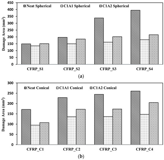 Effect of hybrid nanofillers on the damaged area. (a) Spherical projectile. (b) Conical projectile.
