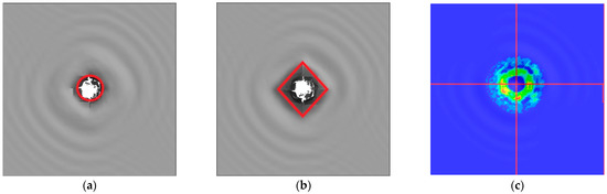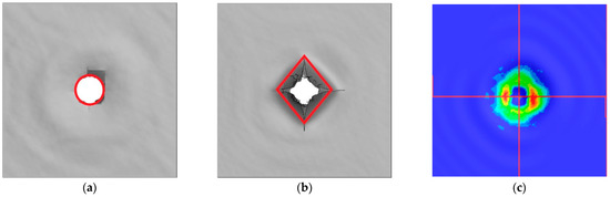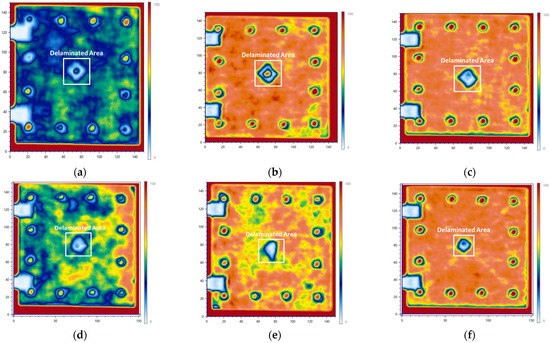 Typical experimental impact damage from C-scan image. (a) N_S4. (b) C1A1_S4. (c) C1A2_S4. (d) N_C4. (e) C1A1_C4. (f) C1A2_C4.