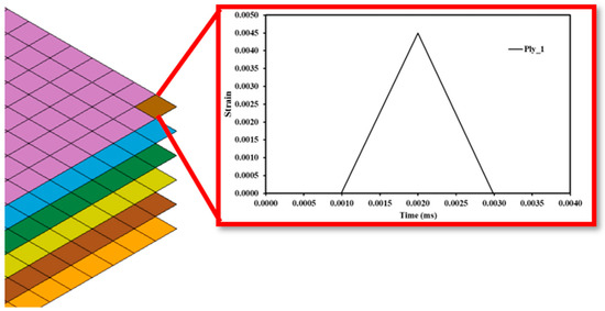 To estimate the residual velocity considering the strain rate effect under dynamic loading, the average strain rate was calculated using the strain—time history for each impacting velocity. Firstly, strain-time history was plotted for each layer, as shown in Figure 13, and then the average value of the 6 plies was considered as the strain rate at a particular velocity. The average strain rate obtained for each impacting velocity was used to calculate the dynamic strength using Equation (9), and the respective values are represented in Table 3. Further, in the numerical simulation, the dynamic strength was updated, and the corresponding results were obtained.