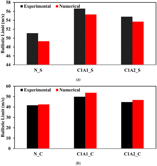 Experimental and numerical comparison of ballistic limit velocity. (a) Comparison of ballistic limit for Spherical projectile. (b) Comparison of ballistic limit for Conical projectile.