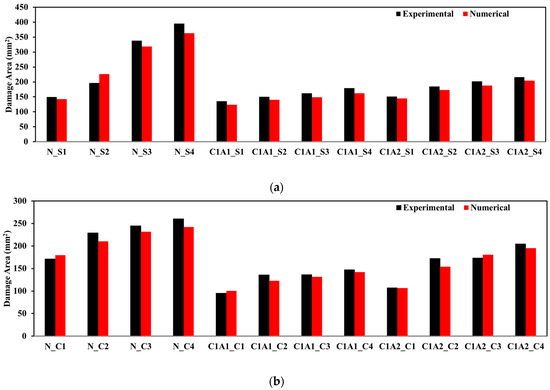 The extent of the back face damage area due to spherical and conical projectiles obtained from the experimental and numerical studies is presented in Figure 18. The damaged area predicted from the numerical analysis is found to be within 10% accuracy compared with experiments for most of the cases validating the numerical approach. The numerical simulation shows a deviation of more than 10% in one case, which can be due to experimental variations. The damaged area is found to be the least for C1A1 samples subjected to spherical and conical projectile impact compared to neat and C1A2 CFRP panels for the same projectile indicating the enhanced energy absorbing capability and more ductile deformation to absorb impact energy by 0.1 wt% MWCNT-COOH + 1 wt% dispersed nanofillers laminates.