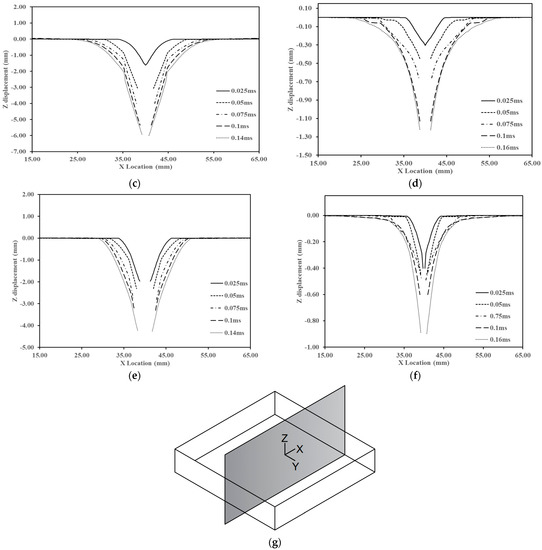 Midplane deflection of the bottom ply. (a) Neat Spherical projectile at 79.6m/s. (b) Neat Conical Projectile at 95.4 m/s. (c) C1A1 Spherical projectile at 79.6 m/s. (d) C1A1 Conical Projectile at 96.8 m/s. (e) C1A2 Spherical projectile at 79.6 m/s. (f) C1A2 Conical Projectile at 96.1 m/s. (g) Plane of deflection measurement.