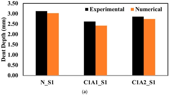 In three scenarios, the impact energy was less than the energy needed to perforate the laminate, so the bullet rebounded during the experiment and dented the test specimen. In this impact event, some of the projectile kinetic energy is lost as a result of wave propagation, resulting in permanent denting, while the remaining energy facilitates the rebounding of the projectile. Figure 21 shows a comparison of experimental and numerical denting, with the spherical projectile impacting at 42.8 m/s for N_S1, 42.0 m/s for C1A1_S1, and 42.2 m/s for C1A2_S1, and the conical projectile impacting at 40.2 m/s for N_C1, 38.2 m/s for C1A1_C1, and 41.0 m/s for C1A2_C1. The denting of the plate in the numerical simulation is obtained from the total displacement by subtracting the elastic displacement. From the obtained data, it is observed that the addition of nanofillers resulted in a maximum reduction of 16% and 40% in dent depth when compared to neat samples for spherical and conical projectiles, respectively. The variation for the conical projectile is higher as the projectile impact velocity is comparatively lower to neat samples. Thus, it can be concluded that the addition of nanofillers had a positive effect on CFRP damage.