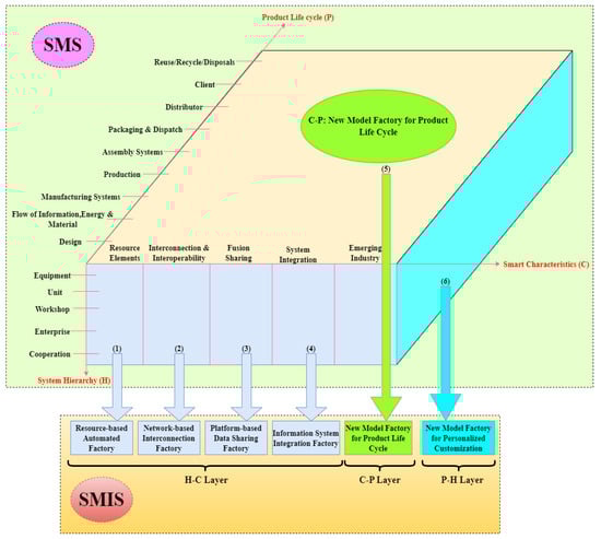 Product Life Cycle (P), System Hierarchy (H), and Smart Characteristics (C) are the three dimensions that make up the framework of SMS, as shown in the upper part of Figure 1. The “Product Life Cycle” dimension refers to the collection of activities that cover the entire procedure from initial product design to ultimate product disposal. The “System Hierarchy” dimension refers to the division of production resources and activities from small to large, i.e., equipment to cooperation. The intelligence function divides the “Smart Characteristics” dimension from resource elements to an emerging industry. The combination of any two SMS dimensions for deployment generates the SMIS layer. There are three main layers of SMIS: C-P, H-C, and P-H. Integrating the ‘C’ and ‘P’ dimensions creates the C-P layer. The combination of the ‘H’ and ‘C’ dimensions generates the H-C layer; similarly, the ‘P’ and ‘H’ dimensions generate the P-H layer, as shown in the lower part of Figure 1. Every layer has its sublayers. For instance, the C-P layer has nine sublayers, from CP1 to CP9. CP1 is related to design; CP2 is related to the flow of information, energy, and material; CP3 is related to manufacturing systems; CP4 is related to production; CP5 is related to assembly systems; CP6 is related to packaging and dispatch; CP7 is related to the distributor; CP8 is related to the client; and CP9 is related to recycling. The elements included in these sublayers are described in Section 2.2. Similarly, the elements included in the H-C and P-H layers are given in Section 2.3.