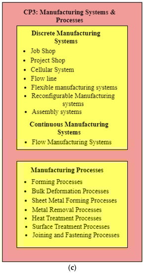 The next layer is CP3 regarding manufacturing systems and processes, as depicted in Figure 3c. Manufacturing systems have two types: discrete manufacturing systems and continuous manufacturing systems. Discrete manufacturing systems include a job shop, a project shop, a cellular shop, a flow line, a flexible manufacturing system, a reconfigurable manufacturing system, and assembly systems. A continuous manufacturing system contains a flow manufacturing system. All machines have the same number in the job shop, and functions are grouped together. For example, if there is a lathe machine, it creates a turning workstation; similarly, milling will form a milling workstation. It is used for small quantities (1–100 parts at a time). In the project shop, the product does not move; the machines move towards the product according to the required work. It also produces small quantities (1–10 parts at a time). In a cellular manufacturing system, different machines are grouped according to the processes needed for the number of products. It is used for slightly larger quantities; the lot size is 800–1300. In the flow line, the proper sequence of machines is grouped according to one or very few parts. At a time, only one part can be manufactured. It is mostly used for larger quantities of 700 to 15,000 parts. A flexible manufacturing system (FMS) combines a cellular manufacturing system and a job shop. It has greater flexibility in process sequence and part types and a higher level of automation. Very little labor work is needed for such a system as it contains the characteristics of two manufacturing systems, which is why it can produce a large number of parts. A reconfigurable manufacturing system is a system that has the capacity for a sudden change in its structure, including the software and hardware components, in order to maintain production as a result of market changes. This is a very dynamic and order-intensive type of manufacturing system. Discrete manufacturing systems produce discrete products, and continuous manufacturing systems produce non-discrete products like sugar, grains, and powder. In a flow manufacturing system, parts are manufactured in stock and not according to specific orders but to follow the sales forecast while considering past orders and inventory. In this system, scheduling and routing can be standardized.