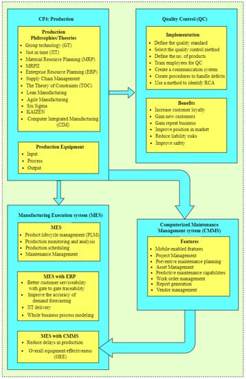 The next layer is CP4 related to production, which is further extended to production philosophies, theories, and equipment, a computerized maintenance management system, a manufacturing execution system (MES), and quality control, as shown in Figure 4. In group technology (GT), parts with the same manufacturing processes, geometry, and functions are manufactured in a unique location using fewer machines. This technology can be applied to any industry, such as plastic molding, foundries, and welding. Just-in-time (JIT) is a management strategy in which goods are received upon request. It is really helpful to increase inventory and reduce holding costs. Material resource planning (MRP) enables manufacturers to schedule, plan, and manage their inventory during the process. It is a software-based system. MRPII is an accumulative information system used by enterprises. It is derived from MRP, with integrated financial needs and employee data. Enterprise resource planning (ERP) helps to manage the company’s supply chain, financial, reporting, human resources, and manufacturing activities. Supply chain management manages the flow of services and goods, including all the operations that convert the raw materials into final products. The Theory of Constraints (TOC) is a methodology for analyzing the constraint referred to as a bottleneck that causes hindrance in achieving a goal and then improving that constraint so that it may no longer be the limiting factor. Lean manufacturing is a technique to minimize waste or resources to maximize profit and productivity. Waste may be anything that a customer does not want to pay for. Agile manufacturing applies to an organization that established the system to enable it to respond quickly according to market changes and customer needs while setting quality and cost. It is related to lean manufacturing. Six Sigma is the managerial approach, including the tools and techniques for process improvement. It has five principles: define, measure, analyze, improve, and control. Kaizen is a Japanese business philosophy, a mixture of Japanese words meaning continuous improvement. It helps to engage all the employees in the continuous improvement of different company sectors. Computer-integrated manufacturing (CIM) is a fully automated manufacturing system with all the processes operating under a computer with digital infrastructure.
