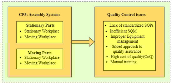 The next layer is CP5, which is related to assembly systems and quality control issues, as shown in Figure 5. Two types are included: stationary parts and moving parts. Stationary parts are further extended to stationary workplaces and moving workplaces. The assembly system for stationary parts with a stationary workplace has a high area and work capacity at the workstation with a reasonably low cost requirement. The assembly system for stationary parts in the moving workplace has a high area and medium work capacity at each workstation, with a medium cost. The assembly system for moving parts in a stationary workplace has a low area and work capacity at each workstation, with a significantly high system requirement. The assembly system for moving parts with a moving workplace has a medium area requirement and high work capacity at each workstation.