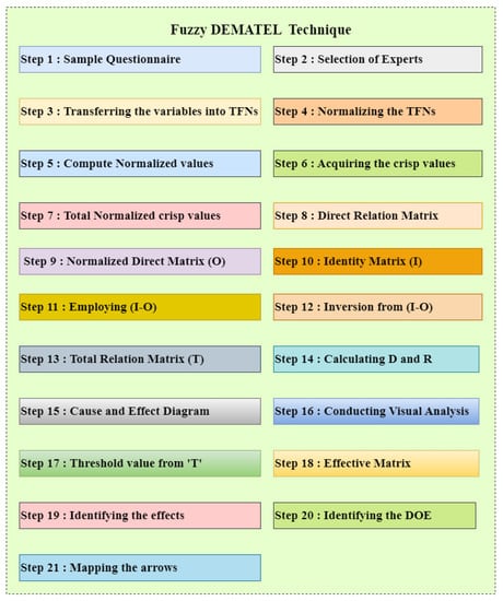 Ravindra Ojha [] used the DEMATEL approach to identify the prominent factors for lean manufacturing in a technology-driven industry. A total of 18 factors were selected, and after analysis, it was concluded that two factors were crucial: significant data acquisition and analysis and technology-driven talent. This study was also helpful for assessing smart industries’ threats to sustainability. Jamshid Afshani et al. [] proposed an approach to combine the fuzzy DEMATEL and fuzzy analytical network process (ANP) to describe the interdependence and weight of each activity. This work had a few limitations, like activity charts being introduced in non-fuzzy formats, which is why a new model is needed that could prioritize the factors without redesigning the activity model.