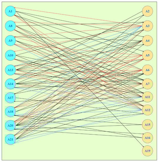 Figure 14 and Table 5 help to describe the interdependence relationship among attributes in terms of weak, medium, and strong relationships. To develop the interdependence relationships among the attributes, the threshold value is 0.0865, calculated from the total relation matrix (T) given in Table 4, using step 17 of the fuzzy DEMATEL technique. Based on this, the effective matrix can be generated by considering those values from the ‘T’ matrix higher than the threshold value; lower values become zero, as given in Table 5. From the effective matrix, the range of weak, medium, and strong relationship zones can be derived: the range of the weak relationship zone is 0.087 to 0.125, the range of the medium relationship zone lies between 0.126 and 0.161, and for the strong relationship zone, the range is 0.162 to 0.197. The zero value means there is no relationship. In Figure 14, the black line arrow shows the weak relation, the red line arrow shows the medium relation, and the blue line arrow shows the strong relation. A11 is selected as an example to understand the concept and describe its relationships with three different attributes having values in weak, medium, and strong zones. The value of A11 corresponding to A2 is 0.118, as given in Table 5; it lies in the weak relation zone; hence, A11 shows the black line arrow pointing towards A2 to represent the weak relation. The value of A11 corresponding to A9 is 0.150 as given in Table 5; it lies in the medium relation zone; hence, A11 shows the red line arrow directing towards A9 to represent the medium relationship. The value of A11 corresponding to A14 is 0.167 as given in the table; it lies in the strong relation zone; hence, A11 points the blue line arrow towards A14 to represent the strong relation. Similarly, A11 has a weak relationship with A4, A8, A10, A15, A16, and A17; a medium relationship with A1, A3, A5, A6, A7, A13, and A21; a strong relationship with A12, A18, and A20; and no relationship with A19. Likewise, the relationships among other attributes can be analyzed. Those attributes that have more relationships and associations with other attributes significantly impact the whole system.